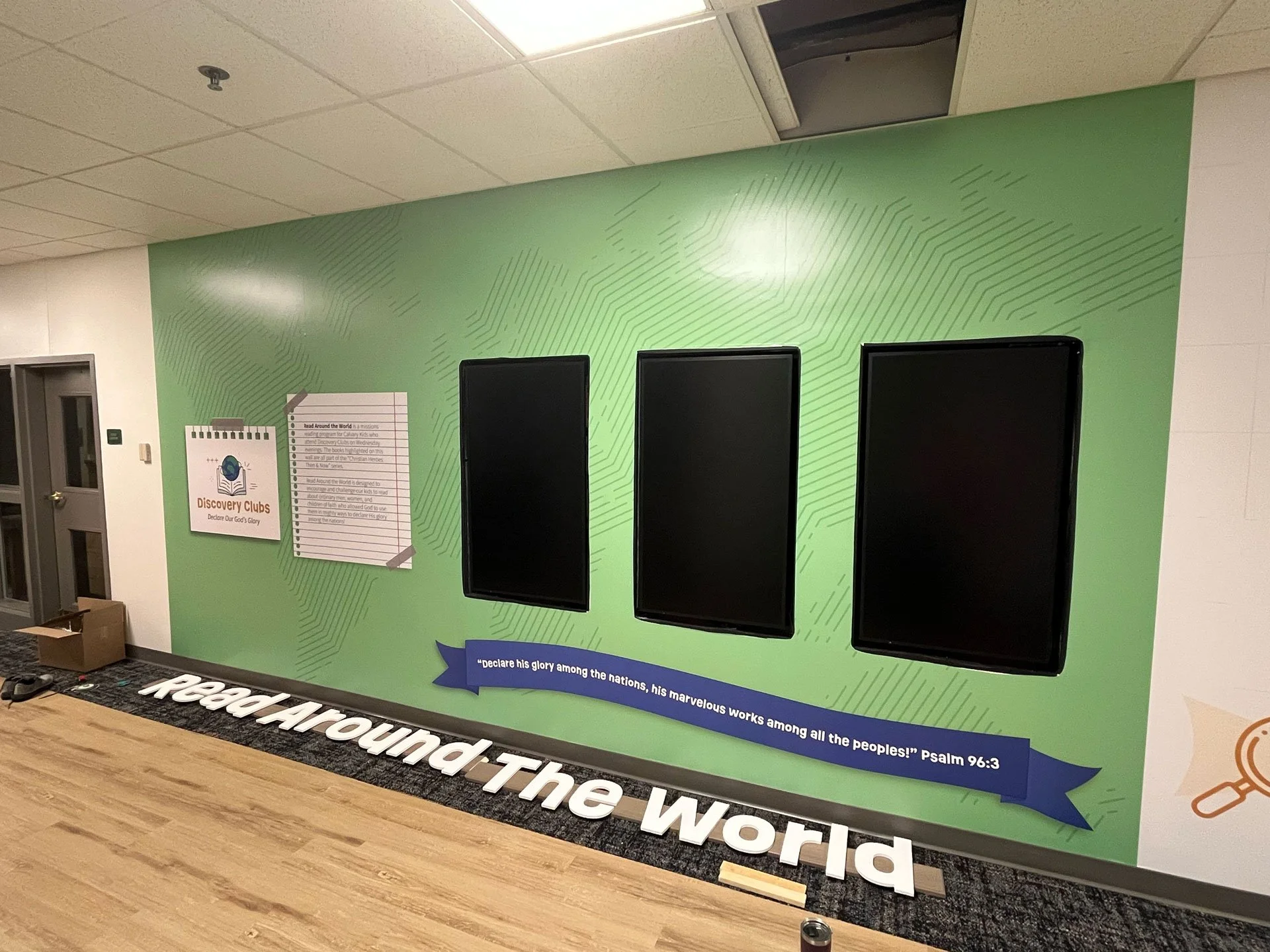 Calvary Church’s Global Ministry department wanted to bring awareness and excitement to this hallway space, as well as provide interactive ways to engage the viewer and provide a variety of resources for church members to be equipped, challenged, and inspired to get invloved.