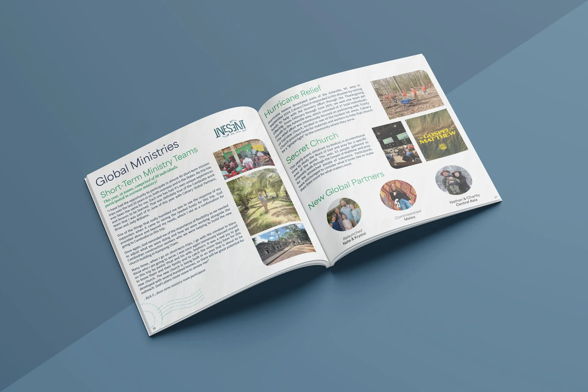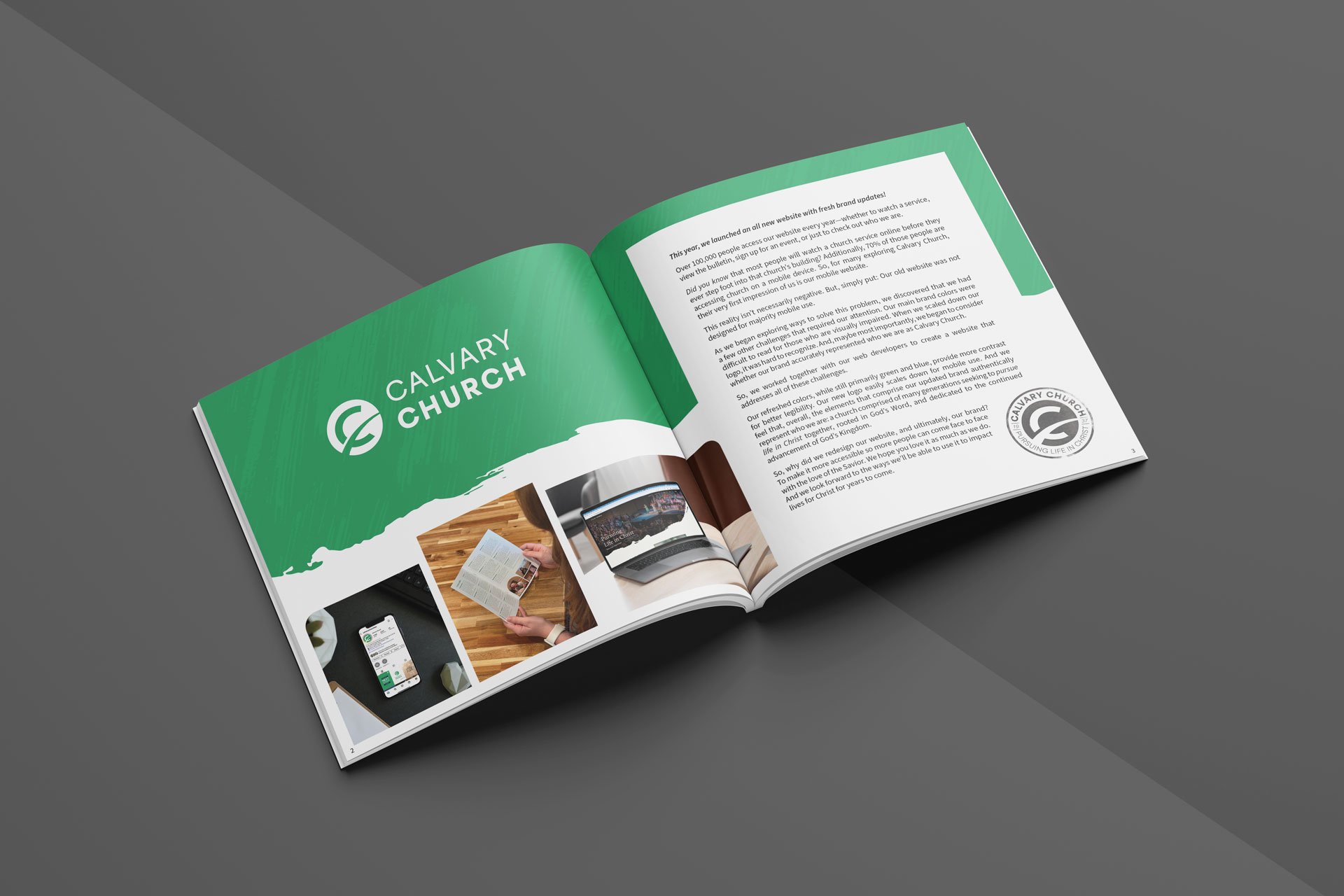 To design a compelling editorial piece that reflects on the past year at Calvary Church, highlighting ministry milestones, key metrics, sermon series, and the ways God has been faithfully at work throughout the church community.