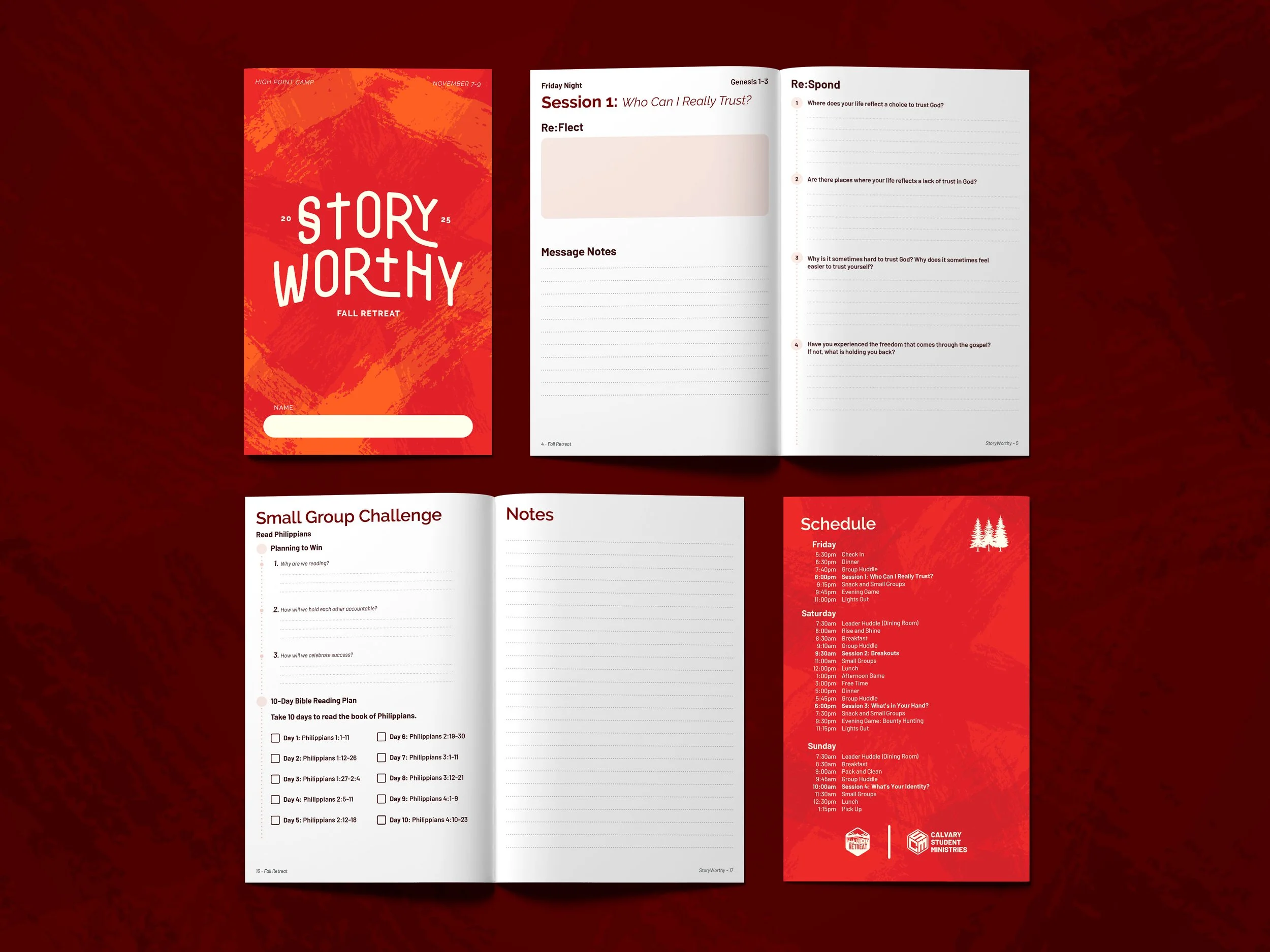 To design a new logo and brand identity for Calvary Church’s annual fall retreat. The theme, StoryWorthy, was based on the reminder that we each have a place in God's story. Over the weekend, 7th and 8th grade students had the opportunity to take meaningful spiritual steps, deepen relationships within their student groups, and grow in connection with their leaders.